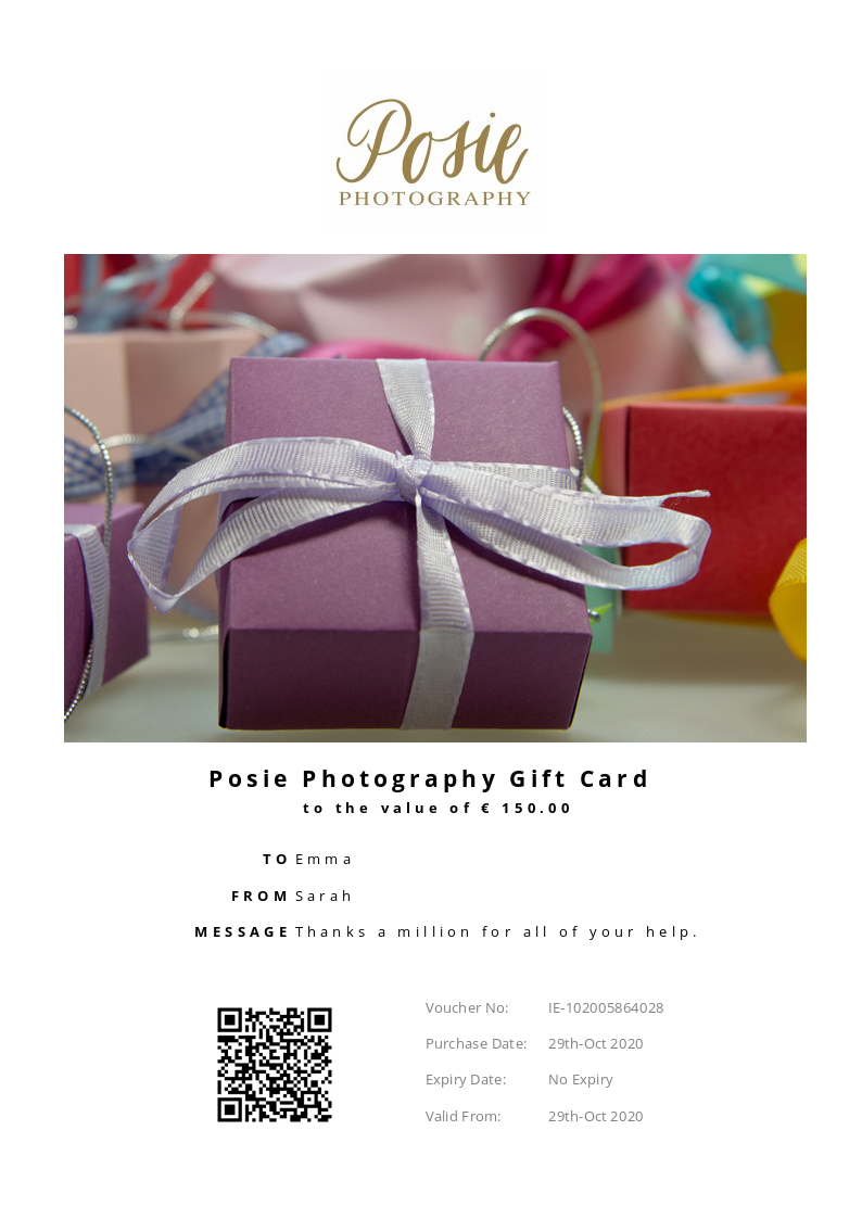 Posie Photography allows you to purchase instantly printable gift vouchers, special offers and tickets using the Voucher Connect platform.